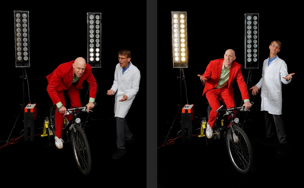 Ein Freiwilliger wird gebeten, auf dem bereit gestellten Energie-Fahrrad elektrische Energie zu erzeugen, die zwei verschiedene Arten von Lampen zum Leuchten bringen soll. Wenn er mit aller Kraft in die Pedale tritt, kann er maximal 4 bis 6 Halogen-Glühlampen antreiben. Wird das Fahrrad allerdings auf die Leiste mit den LED-Lampen umgeschaltet, kann er relativ leicht alle 20 LEDs gleicher Helligkeit zum Leuchten bringen und strahlt damit hell ins Publikum.