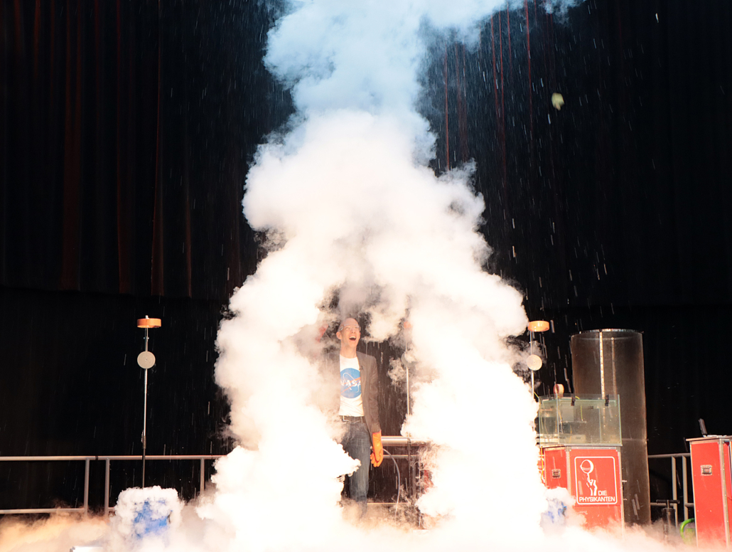 Kochendes Wasser wird aus einem Topf in ein schmales Fass gekippt, in welchem sich etwa doppelt so viel flüssiger Stickstoff befindet. Es entsteht innerhalb von Sekundenbruchteilen eine riesige Wolke.